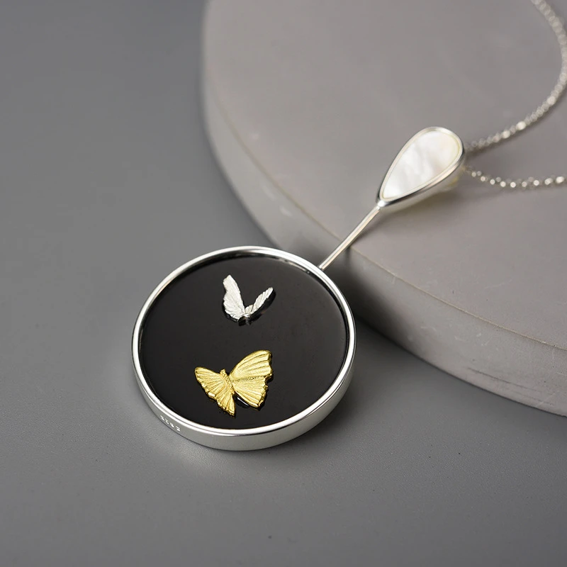 Wholesale Chinoiserie Elegant Water Droplets Butterfly Sterling Silver Inlay Agate Shell Pendant Necklace