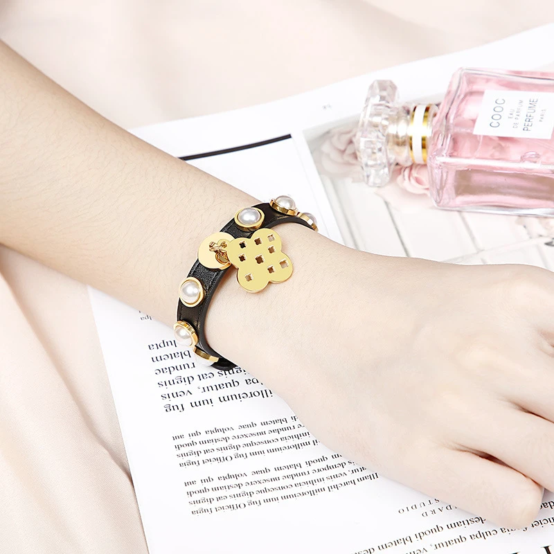 Wholesale Jewelry Hollow Flower Pendant Inlaid Pearl Stainless Steel Bracelet Nihaojewelry